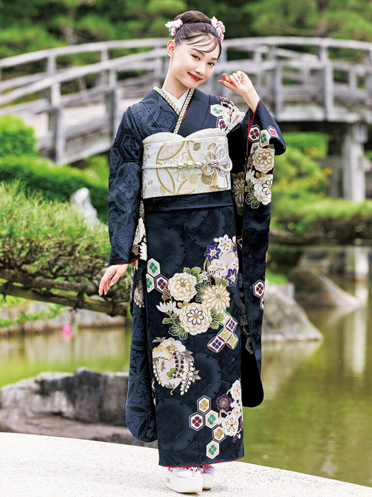 落ち着きのあるネイビーで古典柄の優雅さが際立ち、成人式をはじめ格式高いシーンにふさわしい雰囲気です。